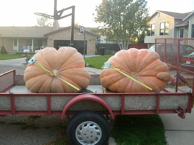 Two on the Trailer. nearly 1800 lbs worth of pumpkin. 906 Tanner 04 on the left- 891 Tanner 04 one the right. So do you ever drive around town with no particular place to go just to watch peoples reaction? :)