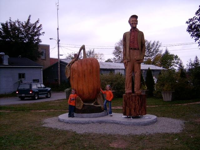 Newly erected statues of Howard Dill and the pumpkin that he made famous. My kids Katherine and Parker standing next to them.