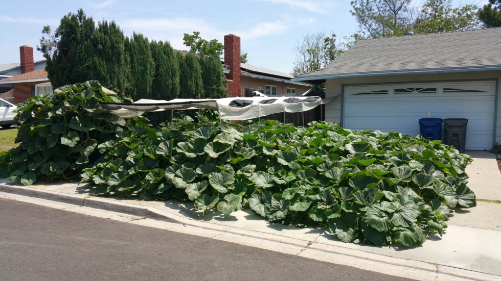 Sure wish I had a larger area with soil to grow in. Only 300 sqft. of soil to grow in, the other 600 sqft of the plant is on cement and everything else. Another round of hot weather coming up for the next few days. Last heat wave we reached 115� and the 1791 did really well with no leaves wilting that were under shade cloth but some of the newest growth that was exposed to direct sun didn't fare too well as expected. Shade cloth going up over most the plant for the next few days.