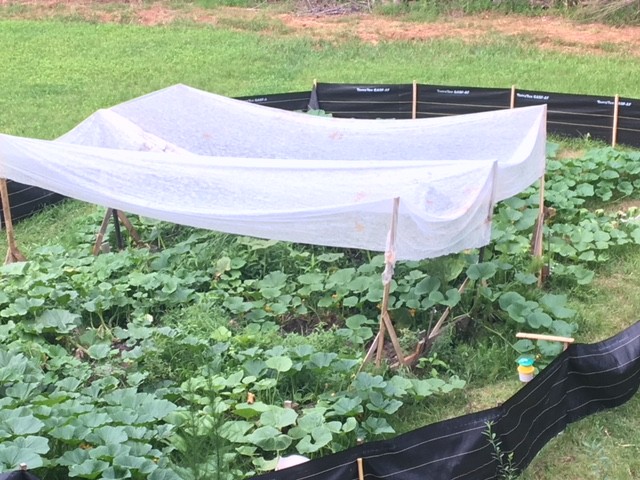 Added some shade to the patch. I have some remay left over from four years ago. It claims to block out 25% of sunlight. Not a huge amount, but sunlight is not something that I am lacking in Georgia. Next year, I will budget for a real sun shade. Not sure if my set-up could survive a severe thunderstorm, but I should be okay with regular rain.