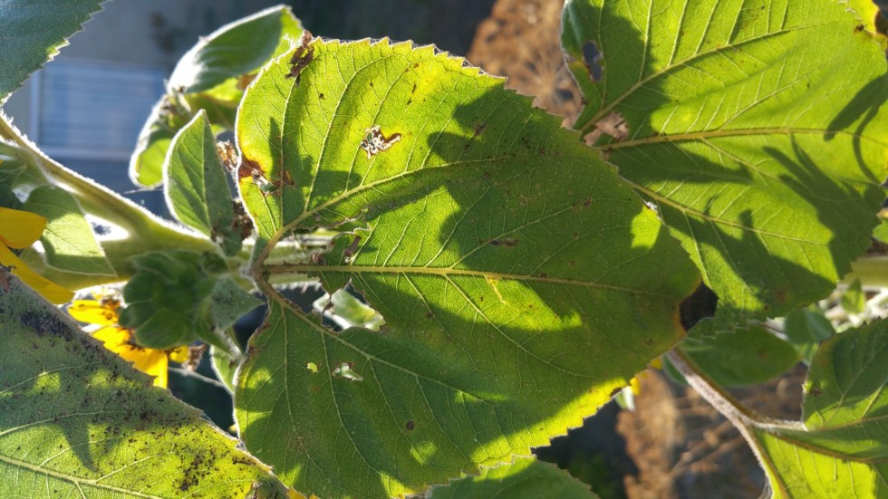 Here ya go SDBigMax, this is what finches do to sunflower leaves.
