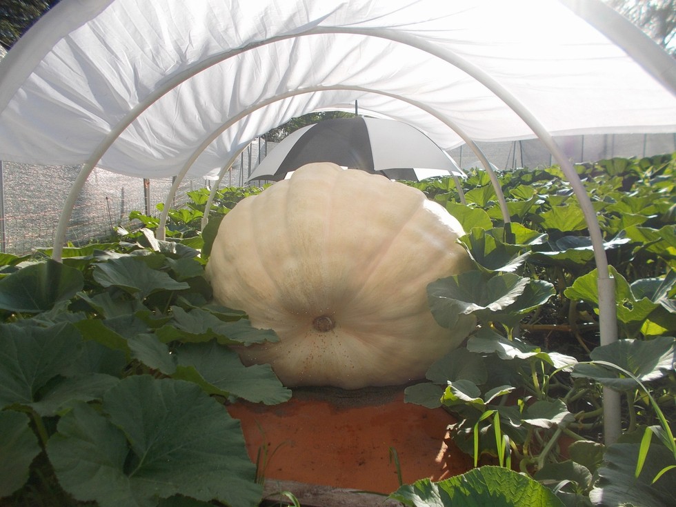 The shade structure on this pumpkin helps prevent the sheet from sticking to the pumpkin since it is starting to sap quite a bit. I do not think this is a bad thing, and hope that it means this pumpkin will go heavy. It has also maintained the nice symmetrical shape even as it approaches 50 days old.