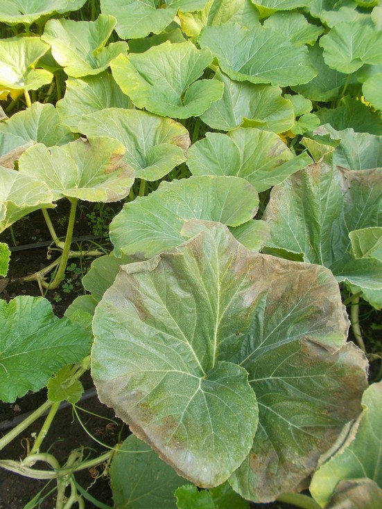 With this image I am trying to show the full disease progression. The large leaf closest in the image has the most advanced symptoms and as you work toward the more distant (and younger leaves) you see where the issue is spreading to. The rate of spreading is literally occurring in hours with the leaves first looking normal than some faint yellowing at the margins that will quickly turn to brown necrotic tissue.