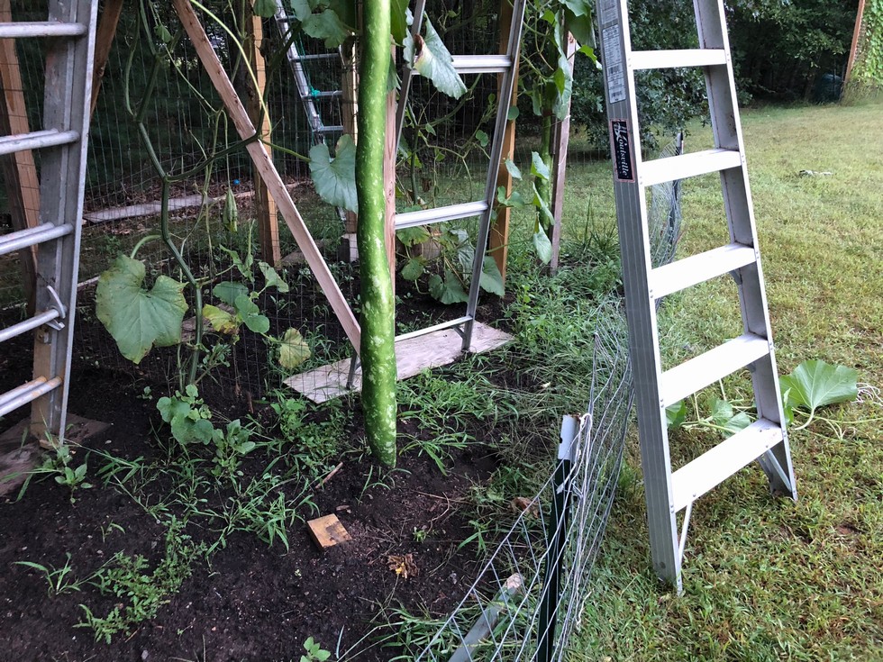 We have a few good long gourds going. These are off our 12 foot trellis. This is the bottom of one. We had to dig a small hole this weekend.