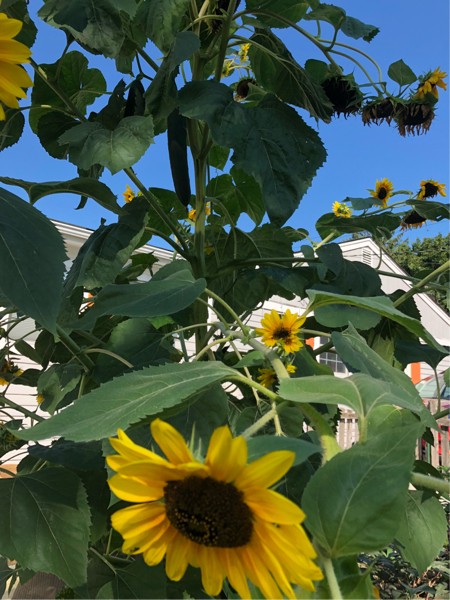 Sunflowers make a nice climbing trellis for the cucumbers this year