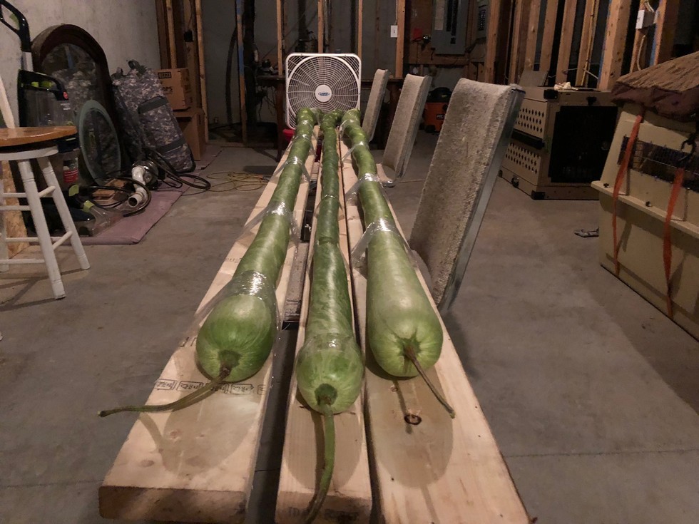 We picked our three long gourds and they are in the basement for safe keeping. I'm posting this picture because we have 3 nice LG's and 2 of them are almost exactly the same length (within 1/8 to a 1/4 inch). The one in the middle is a couple inches longer than the other two. We plan to take each of them to separate GPC events and we wouldn't want anyone to think we are trying to take the same gourd to two different events.