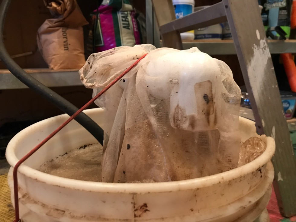 The next few posts are for bluesilver. Here is the set up for using a 5 gallon paint strainer bag as a "tea bag" for the air lift brewer. When the batch is done. Clean up the bag in bleached water and it is ready when you do the next batch. Also on the lack of foam, you have to clean all the equipment in bleached water after every use, or you get a bio film build up that can spoil the next batch. Let thing sit for a day or so after cleaning in the bleach water and the bleach will all be evaporated.