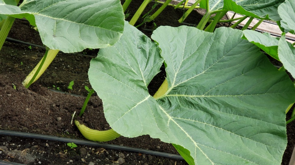 If you look closely at the base of the leaves you will see the little white top roots trying to find water and nutrients. If I see them and can reach them, I'll bury those with more soil. So that's it. About as simple as vine burying can be. No messing around with the vines. No digging trenches that mess around with the vines. No moving drip tape that messes around with the vines. No worries about flowers. If there was a tertiary that you wanted to keep just bury it as well. They all will grow out on their own.
