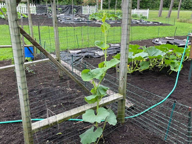 Here is the 126.5 Jutras long gourd on the trellis next to the tomato hut. This plant is 43� up our 14.5 foot trellis.