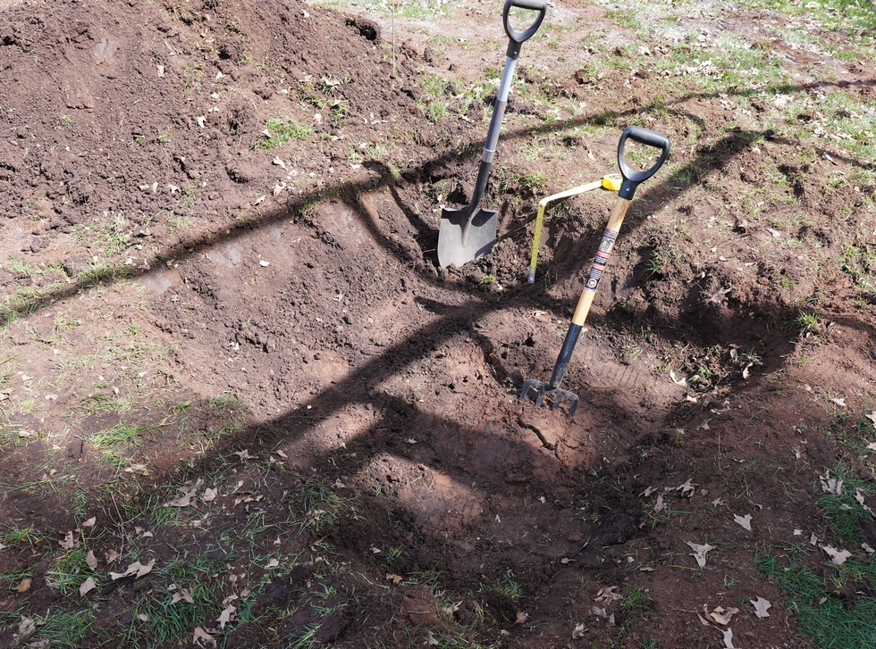 Here is the area (about 5ft. x 5ft. x 1 ft deep) that is where the 40ft soil heating cables will be buried. The soil is initially excavated and then the bottom is pitch forked to increase aeration and water infiltration. Doing this about 12-inbches below the soil surface helps increase drainage and keeps the main starting area on the dryer side which should help mitigate potential issues in this very important area of the plant.