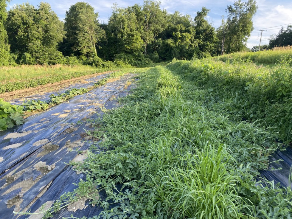 This is a row of eating watermelons, they are growing out over plastic mulch. Unfortunately, the middle of the row is full of grass. I don't think this will hurt the production at all. Some of the varieties in this row include 'jubilee', 'crimson sweet', 'sangria', 'Iopride', 'willhite tendergold' and 'Royal Golden'. There are also a few big and tasty seedless watermelons from Burpee in this row. the big and tasty look like a round compact Charleston Gray