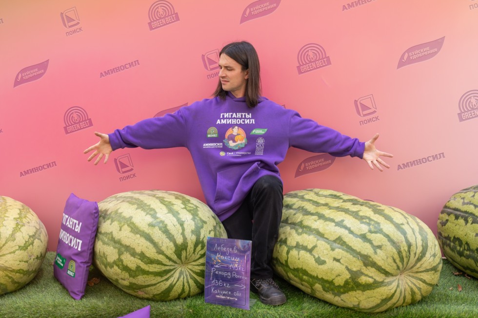 To my left is Maxim Lebedev's largest watermelon in Russia, weighing 319.2 pounds.
