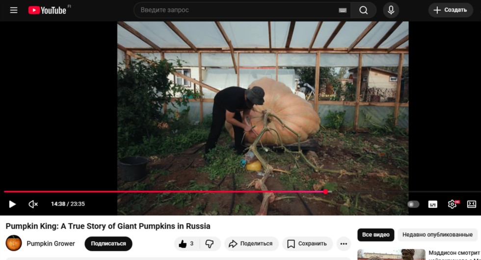 YouTube English subtitles are present. They can be set in the settings. The director of this film is Mikhail Alexandrov. I met him a year ago and he told me that he was looking for a topic for a short film for a competition and he liked the idea of big pumpkins. We discussed the concept of the film with him and he was able to win the competition and get funding for filming. The film is essentially a documentary, although some elements have been added for intrigue and to enhance the story. Enjoy your viewing.