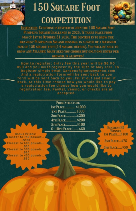 Who is ready for the 150 square-foot challenge? Yes this unique competition takes what we love about growing giant pumpkins and brings it down to a scale that is not only easy and manageable for newer growers, but at the same time gives the seasoned growers a run for their money as they will learn a lot putting everything they know to the test in a miniaturized pumpkin patch.
