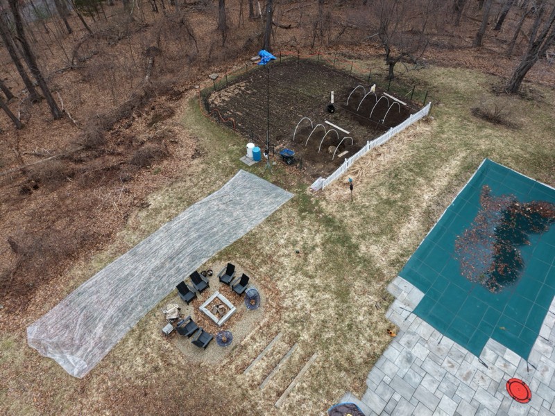 A drone shot before I put the plastic on the hoop house without the big boulder. Definitely a huge difference with this greenhouse plastic!