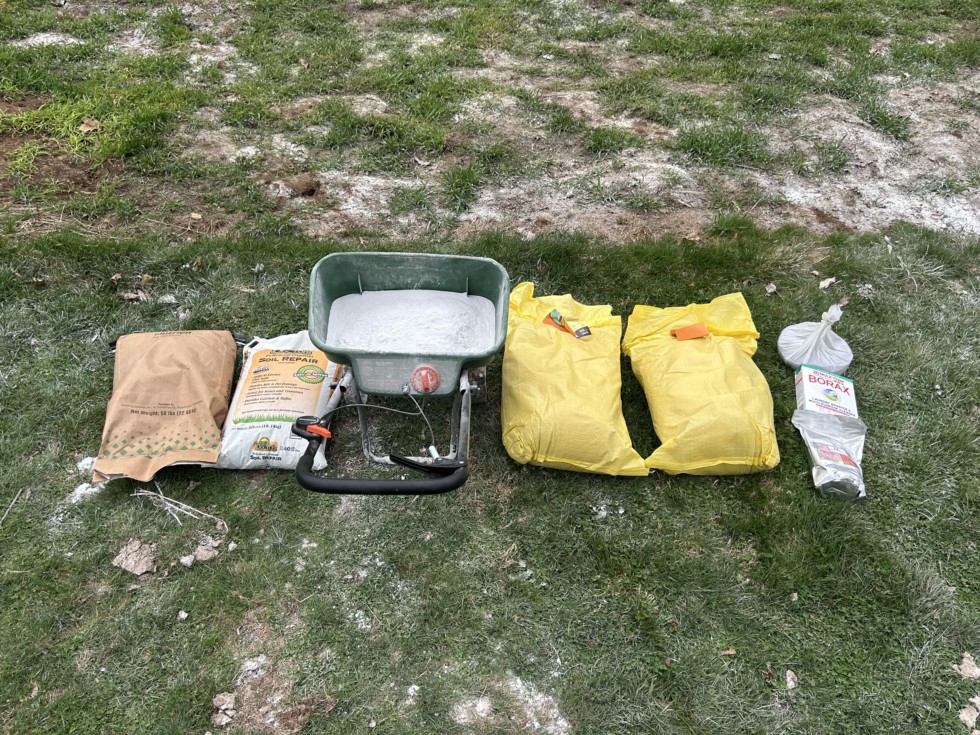 This year's soil amendments (left to right): - 50lbs SOP - 720lbs Gypsum: last bag pictured - 120lbs Dolomitic lime in the patch and 40lbs around the perimeter - 90lbs Mustard seed meal - 5lbs Rootsheild+ Granules - 3lbs Borax - 5lbs Manganese sulfate Now for my least favorite part of the season, tilling! There's a rainstorm tomorrow so I have to get it done now so the mustard can activate after it's been mixed into the soil.