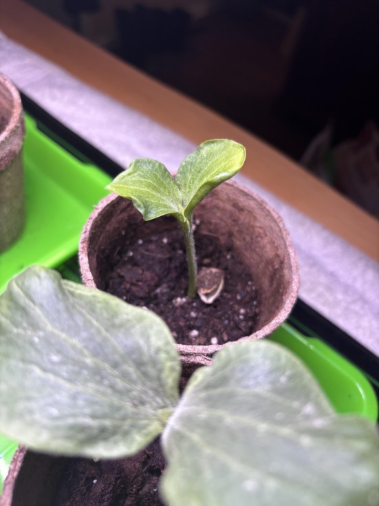 The little plant that could! I thought he was a dud but he started showing some signs of life yesterday afternoon. I turned him so that the biggest part of the leaf could get the majority of the light during the day yesterday and this morning, I found his little seed dangling off his newly formed leaves! And he has a tiny true leaf forming in the middle! He's the only one that doesn't seem to be growing through his peat pot yet, but I'm still hopeful for him. I just realized this morning that people can comment on grower diaries! I saw everyone's advice and it's too late to move them from these peat pots obviously, but I'm planning to transplant them this weekend when the low temps will finally be in the 60s instead of the 40s and the daily highs will be in the 80s. I'm mostly going by the How To Grow World Class Giant Pumpkins books 1 - 3 and some online research I've done to supplement, and they recommended the peat pots so that's what I used. I was going to use coffee cans, but everything I see online says that the roots are super fragile so I went with the best option I could find that wouldn't allow me to accidentally disturb the new roots. Four out of the five have tiny little roots sticking out of the bottoms of the peat pots but it's not extreme so I think they'll be okay for now. When I plant my backups, I'll see how they go. Like I've been saying, it's my first time trying this and I'm going in with no expectations of it going well haha I will say, it seems like there's a million different ways to do everything so I'll see what works best for me. I work from home so I spend all day worrying over the little seedlings and I'm sure when I transplant them, I'll be going outside every hour to check on them. I'm hoping that giving them all this extra love and attention will be enough to cover some of my mistakes haha
