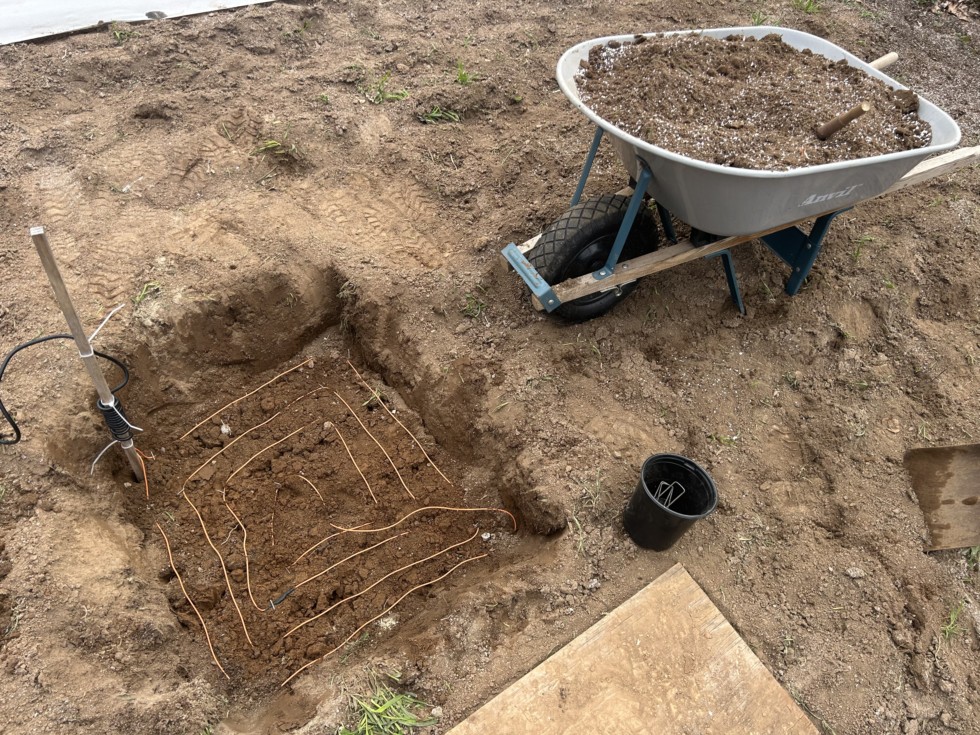 Planting hole prep: 1. Dig 3'x3' hole 10"-12" deep 2. Mix in a bag of miracle grow perlite to the excavated soil. This both feeds and aerates the soil as it has a small amount of fertilizer in it. I also added a very small amount of coir based seed starter just to get rid of it. I actually don't want much OM near my stump since I want it to drain nicely. 3. Install heating cables. I attached the main wire to a pole to make things neater. These cables are the 24' ones off of Ron's site. I know people like the giant gutter cables but I think these will suffice. 4. Backfill with mixed soil and repeat.