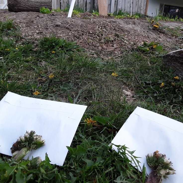 The dandelion saga didn't end even though I again swore it would. Here it goes! In total I found TEN dandelions with 6x megas, and these last two were right next to this little lettuce garden where later on I intend to put a few tomatoes. Great! Seems to portend positive possibilties! I was truly excited to see this. I thought that was so cool. But then...