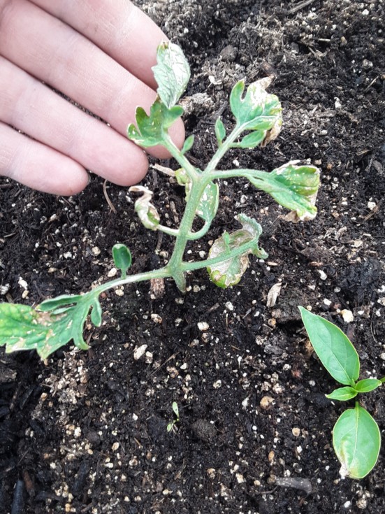 Yeah I was in a weird "well why not" mode. Over here I put a tomato leaf in the soil to see if it would root. (And then do what? It has no further points of growth.) It rooted superbly though. I remember the roots being surprisingly robust when I planted it. Why did I even plant it. Well at least it helped me remember the monkey madness that created it, plus that previously mentioned sad plant which is pictured in my next post.