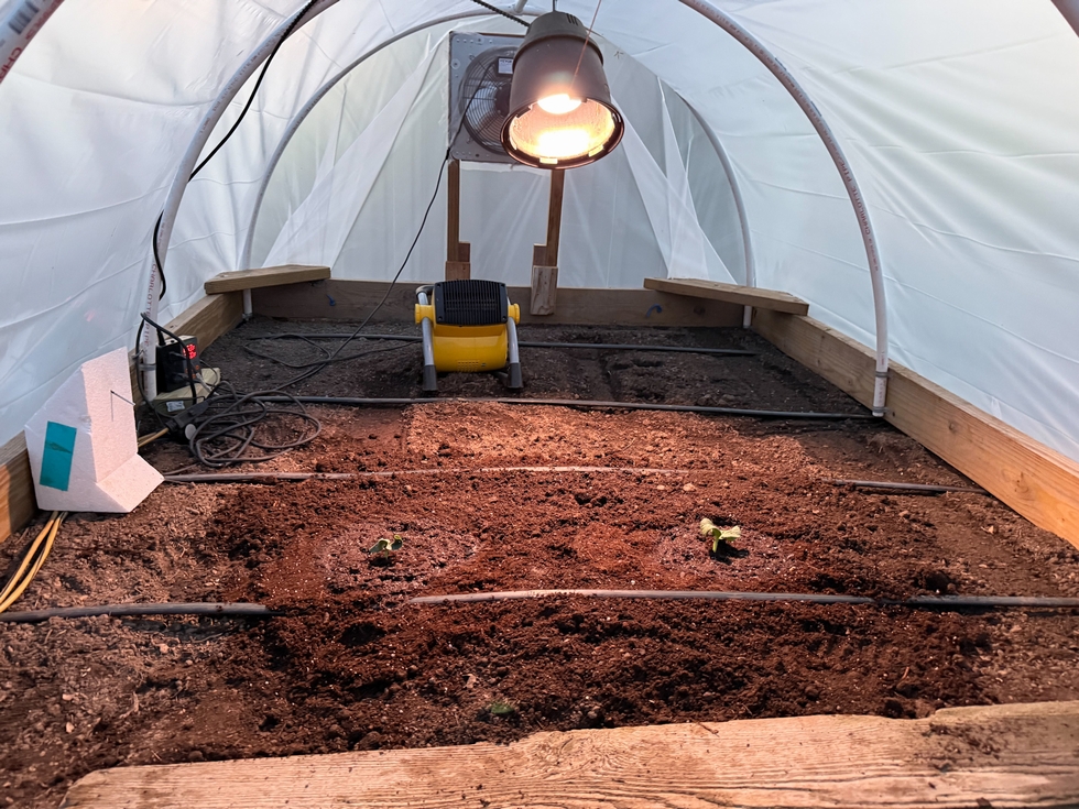 4 plants in the ground, DAS 7. Double planted the mini-greenhouses, one with two 2266 Kisamore plants, the other with two 2453 Sherwood.