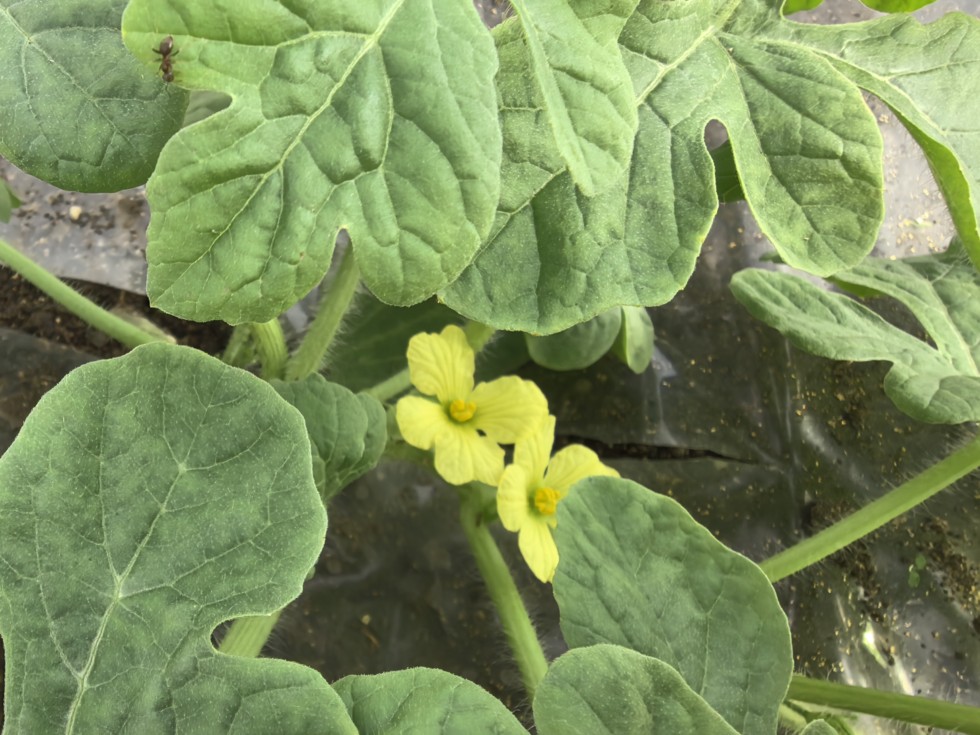 Today, the first male flowers unexpectedly appeared. The plant is doing very well after the transplant, growing two inches per day.