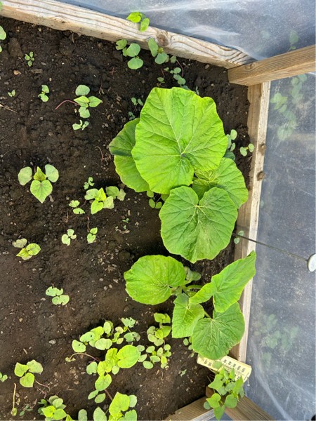 These plants are 5 days younger than the others, which means they have been in the ground for 6 days. The plant on the top is a 2491 Ford and the bottom one is a 2469 Ford. The other little plants are the remains of a buckwheat cover crop.