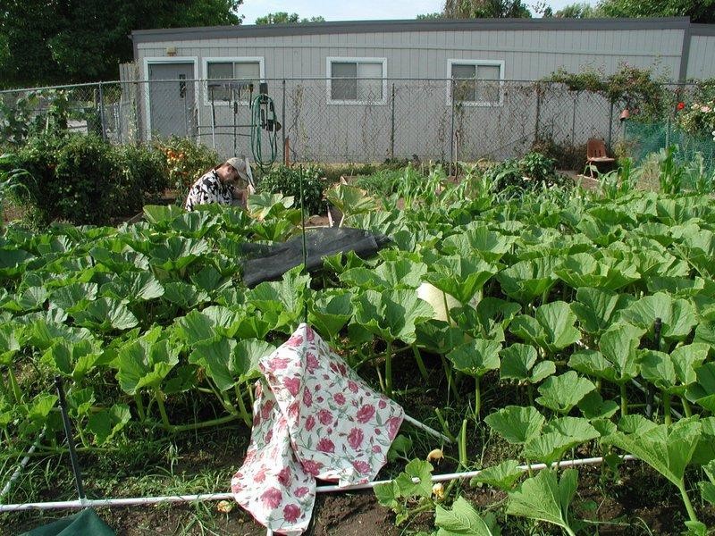 A few pictures from the Orange garden to follow. This is the patch with Dave working on sprinklers, shade cloth all over etc. Ripped out the sugar baby pumpkins - PM. The 719 North Main fruit is visible in the middle of the patch. I need to get shade structures up soon. Adjusted the timer to 20 minutes of water 4x a day (9,11,1 and 4) until this heatwave breaks. Almost everything is deadheaded.