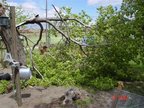 Well it has been a crazy day wind gusts hit 92 km/h, that is three days now this month with winds over 80km/h gusts. Ya the Canadian Prairies are windy but not usally this bad. Lost a limb off a tree, the top off another one and the tree that lost a limb a couple weeks ago finally went down. (pic below)