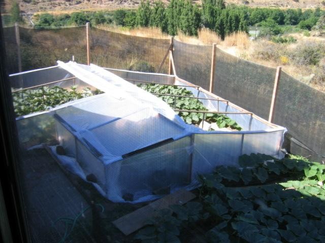 Here it is a little later in the morning with the roof rolled up. This 400+ sq. ft. "greenhouse" has 3 1500 watt forced convection heaters to keep the plant and pumpkin toasty. I get dizzy watching the electric meter spin :-) As the days get colder, I'll start leaving it closed up during the day to keep things as warm as possible. The things we do for our pumpkins.....