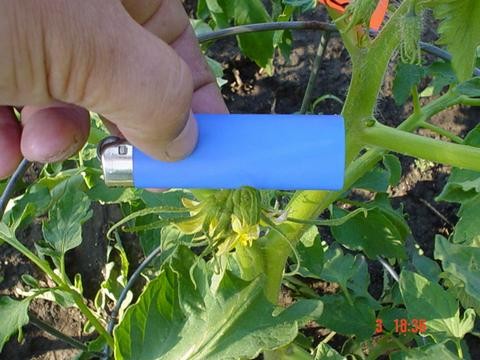 The update is with my maters... As you might know I pollinated and did some breeding on Sat. I beleive it was mentioned in an earlier entry. Well today the maters are starting to swell. The pic here shows my number 1 with sepals measured against a regular size lighter notice the length... Ya that is right roughly 3 1/2" inches across, fully stretched and once opened completly they will reach at least 4". Figuring this and adding at least 2 inches on the low side puts this monster mater at 8" across and I have noticed in past years with the sepals on the Thunder Creek Tomatoes you can add the length of the sepals on each side. Can ya say 1 foot across but this is just the top of the mater add an inch on each side for a middle measurement that's a whopping 14".