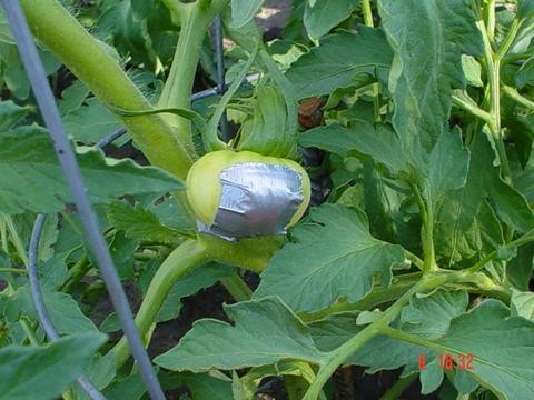 Well problem solved with the number 2 plant. Should be a real biggin at the tomato weigh off. "Split?" what split, I don't see any split... (ain't duck tape a wonderfull thing.) LMAO