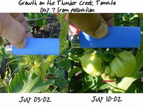 Had some people asking 'bout my thunder creek tomatoes recently so I will update this for them as you know number one was shown with sepal's at about 3 1/2 to 4 inches july 03 and since has gotten two good splits in it from rapid growth, but looks like they are closing and healing with brown scars so it remains on the vine. This updated pic shows the growth in the last seven days, and with roughly 50 days left it looks like it will measure it's 14" across the middle.