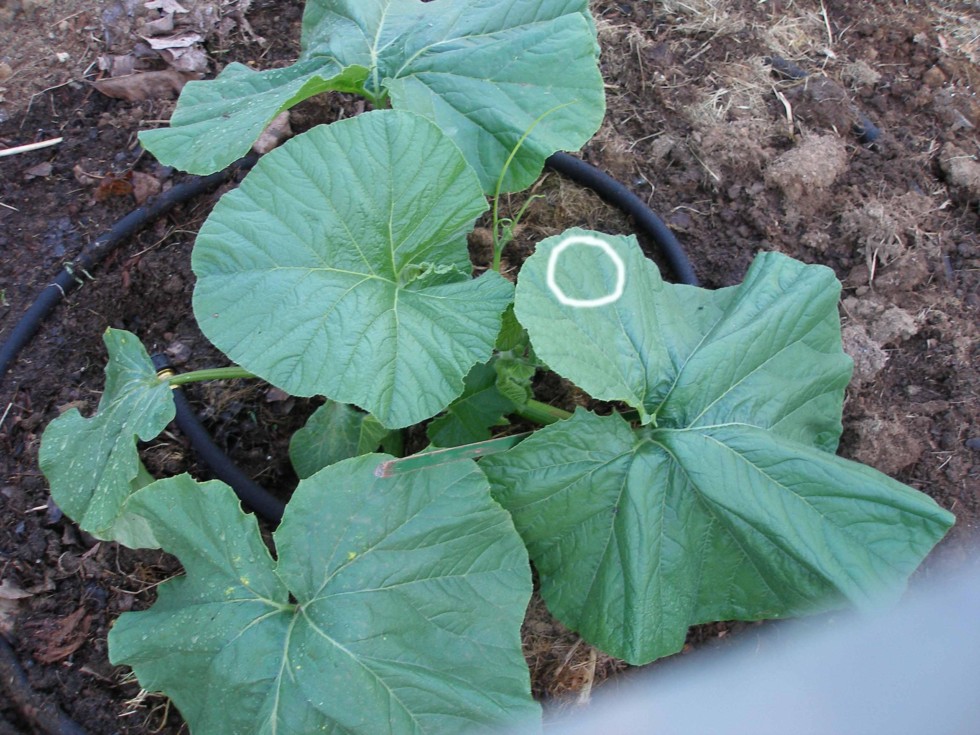 Here is a picture of my 1446 at 23 days old. I have drawn in a white circle on the photo to indicate where the main vine is (right under that part of the leaf). I have inserted a stick in the soil to try to direct the large leaf at the right of the photo to the right so that the main can extend out underneath it with ease. Right now the main vine seems to be going almost straight up, but I think the gravity of the hill, and the size of the vine as it grows should pull it down soon--if not I will start to train it down in a few days. There are couple of tendrils out that are not grabbing onto anything yet.
