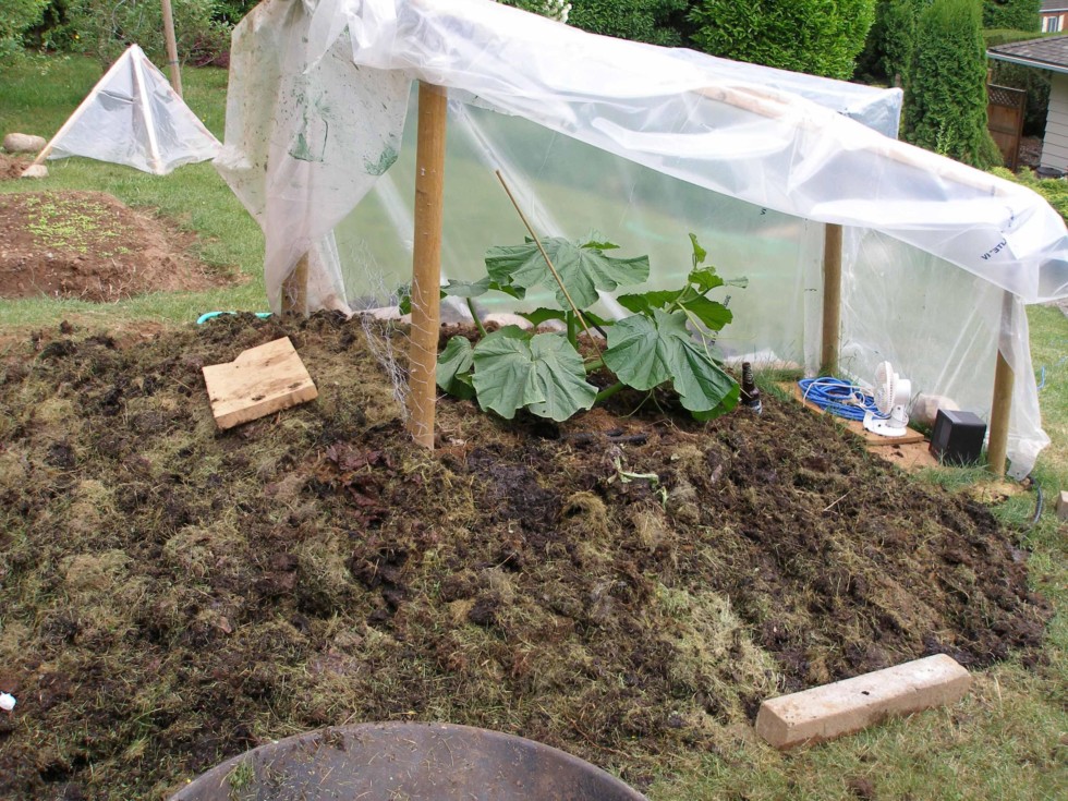 Here is an updated picture of the 1446 at 27 days old. Still continuing my compost efforts continuously, and when I have time. I saw my neighbor mowing his lawn and asked if he wanted me to clean out his compost bin. I had been eyeing his compost bin for quite some time as it is about 5X5 and he fills it every weekend with grass trimmings/and or leaves from his huge lawn. It hasn't been cleaned out in a few years. He agreed, of course, and when I went down ther I found about 18 inches of black mud-like soil filled with red wigglers underneath about 1 foot of grass. I loaded up about two-thirds of the compost bin (12 wheelbarrows) and spread it around the pumpkin patch--and especially behind the plant. The stuff was so black and sticky that some loose grass clippings stuck to it (as you can see in the picture) I may load up the rest when I have time, or clean it for him next year again. It was hard work as I had to pack it about 200 meters in a wheelbarrow and up my steep backyard. Really happy to get this kind of compost though--I mean, you can't buy stuff like this. I think the soil amendments are almost done and I believe I have enough to power a good sized fruit sould everyting else fall in line. Gave the patch a little soak--40 minutes--we are expecting rain. Also bought another 100 feet of soaker to wrap around the mound again (as some hose is buried, and I will need more for the vines)
