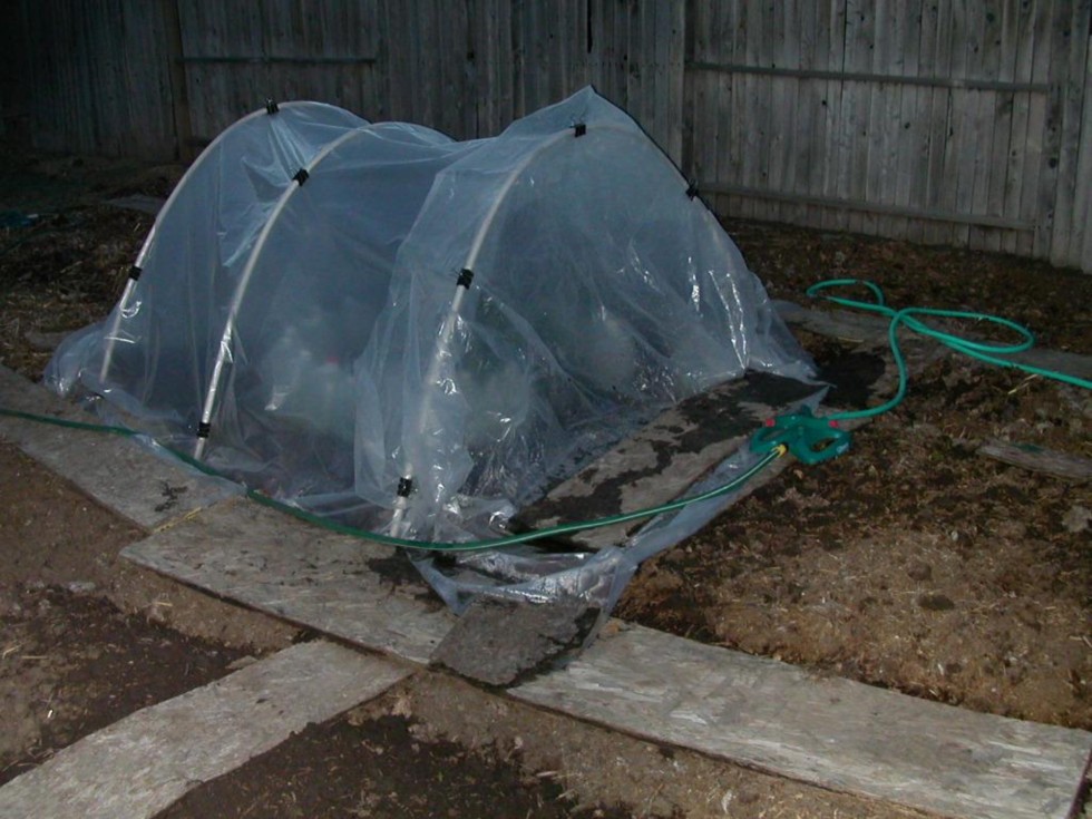 This is what one of my hoop houses looks like. Not very fancy but it works for me. It is about 7 ft x 7ft. It is made of three 10 ft pvc pipes going into 2 ft re-bar. then a 12 ft x 10 ft section of plastic covers the top.