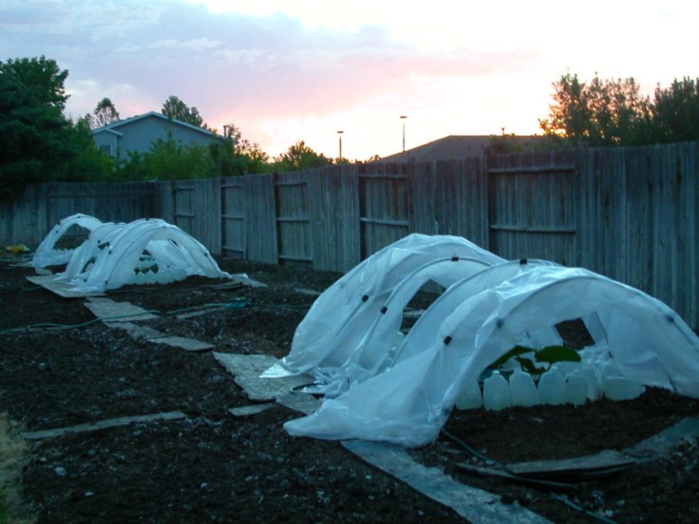 Here is the entire patch just before I closed up all the hoops house for the night. Each plant has approximately 20 milk jugs full of water around it in a ring to help keep them warm at night.