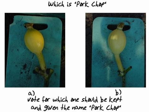 The Pic enclosed is a pic of the two prominate pumpkins, my daughter has agreed to posting them in hopes that you the pumpkin growing public will help decide which will be culled and which will be named "Pork Chop" Simply go to general discussion and vote at "Vote for Pork Chop". She likes this idea as she has asked before what the website was (she likes disney.com) and I told her it was were people help you grow giant pumpkins.