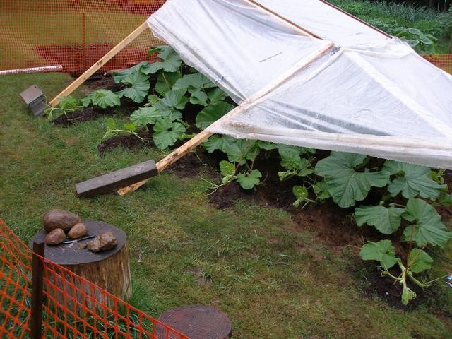 Yesterday was a cool and rainy day—I got soaked working outside for 2-3 hours. I finally lifted part of the greenhouse and erected a perimeter fence around my entire pumpkin patch. I have had raccoons, rabbits, and squirrels going through my yard for a long time, and this was a precautionary measure—don’t want them getting the taste for my pumpkin blooms. Also, there is a neighbor who consistently lets his dog out at night and he often journeys to my yard to defecate and tramp wherever he sees fit. Not taking any chances, I weighed down the fence on all sides and will weigh it down more to prevent problems with wildlife. Got my first male yesterday—cut him off and froze him just in case—a couple of my other males had blossoms that rotted off—hope this does not become a problem. Moved more dirt under the vines as you can see in the photo, and also around the mound where pumpkin roots were literally shooting out of the soil on one side. Tomorrow I dig a resting spot for growing the pumpkin (I am on a hill) and possibly remove more of my greenhouse. Some tendrils near the end of the main and secondaries are splitting wide open—happened after I gave the plant a 30min water after a hot day—not sure why, but it seems every so often when I water the plant I get tremendous growth, or something blows or splits the next day???