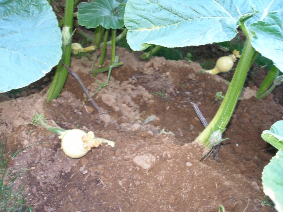 Here is a picture of the top left of the plant with three pumpkins on 3 different vines. There are three other pumpkins that I have not shown in pics because I didn't have time to take anymore pics--I was getting eaten by mosquitos! Notice the leaf is a little yellow in the photo--as I mentioned I have several leaves yellowing slightly--and many of the young ones are burning in the heat. Nothing special about these pumpkins except the one on the top left has a really nice long vine--but it is on a weak secondary and it has an odd green strip/ball protruding from it. These ones are between 5-6 days old and have a circ of 9-10 inches. Please e-mail me with any comments re: what pumpkins look good at this stage and regarding leaf yellowing. 2 more pumpkins to pollinate on this plant tomorrow (my 10th and 11th pollinations on this plant!) Like I said, any comments on what looks good at this stage, please let me know. I will probably keep pollinating pumpkins (there are tons more females) and start culling when they reach volleyball size. Any other stragegies people have please let me know.