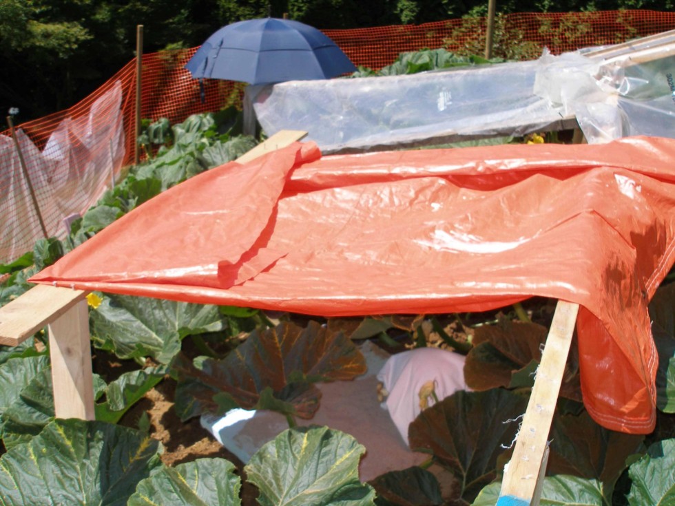 Here are my current shade structures for my two best pumpkins. I have placed the tarp over a couple of supports and will unfold it as the pumpkin grows--it is stapled on. I could unfold the whole tarp and just staple it, but why cover unnecessary leaves and prevent photosynthesis. I will extend the tarp as the pumpkin grows. The one on the main gets an umbrella zap-straped to a 2X4. I will improve that one as time creates a necessity. The other little ones are under leaves and get no special attention until they have proven themselves. Most secondaries have been dead-headed. The plant is pretty much as large as it will get (about 25 X 25 feet)