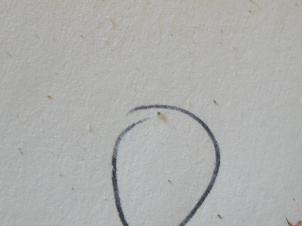 I shook the leaf on a white piece of paper. Here is a close up (as close as I could get) of the little bug that came off leaf. It was the only thing that moved on the paper. The critter is at the 12 o'clock position near the top of the circle. I circled him with a pen and then took the picture. So the line is the width of a fine ball tip pen.