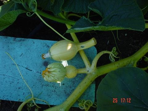 Here is a pic of the #2 on the 700 Paynter pollinated on the 23rd of July and of the culled one off from the store bought ag also pollinated on the 23rd. culled due to a split in the blossom end. Notice the size difference of the two, this is the size pork chop started out like and as well his sister at the other end of the vine. but this plant is way slow yet is in the same patch and is cared for the same...