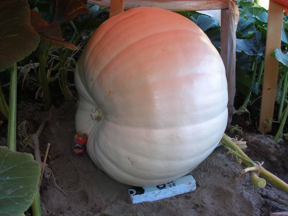 One thing that concerns me is that the shape of this pumpkin is not ideal. I mean the pumpkin is wheel shaped and has a concave blossom end. I wonder if it will split by the blossom--as I have heard this can happen with wheel shaped fruit. The other one is of a very similar shape. In fact all the fruit this plant put out were very similar in shape. There was one early on that was a bit longer in shape, but it was in a bad position. I even looked at a picture of the 1446 that Al Eaton grew and it looked like a wheel that had slowly started to sag under the sheer weight of itself. So far no real problems on the stem end or blossom end. I am keeping the pumpkin covered with a blanket, so it is staying pretty white.