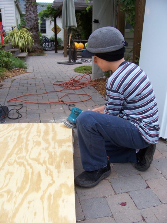 Riely, getting the pallets sanded and ready for loading.
