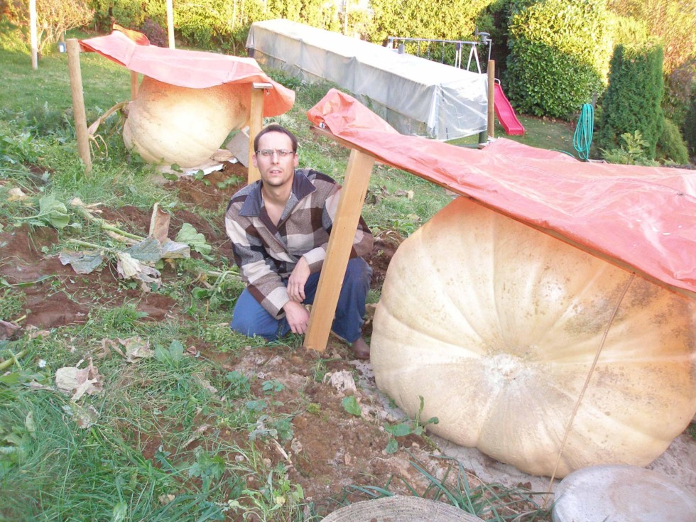 I cut the plant out today and put it on the compost pile. I also deconstructed all the plastic and poles. On retrospect, it was such a dry summer I didn't even need all the plastic covering the plant. Oh well. Here is a picture of me with my two pumpkins. The big one is estimated at 752 lbs and the smaller one further away is estimated at under 500lbs. I will be working on the soil all next week digging and extending the patch. I might have someone who can give me some good horse manure (aged stuff--a couple of truck loads) only problem is I need to get it somehow. I will be adding a ton of leaves hopefully (I have huge maple trees around my lot).