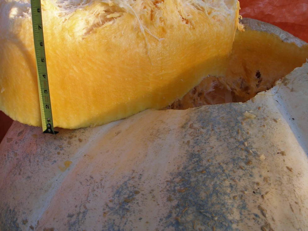 Here is a shot of the flesh on the 800 from the blossom end. Definitely quite thick. However, on the stem end it was incredibly thick (12 inches or more) filling an entire third or more of the pumpkin from the stem side!