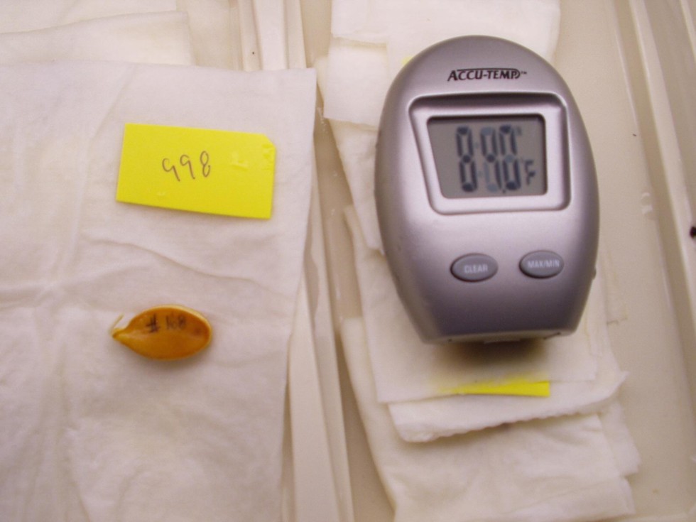 998 Pukos was sprouted at 24 hrs in the paper towel. This picture was at 36 hrs. I potted all 3 943's, all 3 995's*, 824*, 1055*, and 1 of the 898's*. The 1041 and the 772 haven't sprouted yet. Back in the germinator they go. Fingures are crossed.