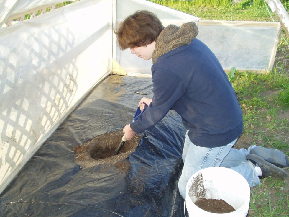Tonight we planted out the long gourds. Here Ryan digs a planting hole in the prepared area.