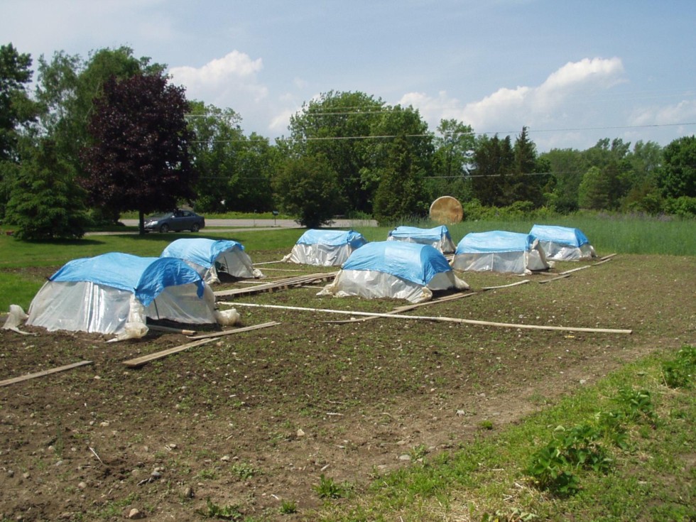Extream heat and humidity the last two days. I removed all the black plastic last night. Soil temp last night inside the hoops is 80F. 90F outside mid day today. Pumpkins are gowing fast, with the 998 leading the way with the main at around 4' and right at the door of the hoop. All plants flagging badly today in this heat. I decided to shade all plants with tarps. Plants are too small to remove hoops as they need the wind protection.